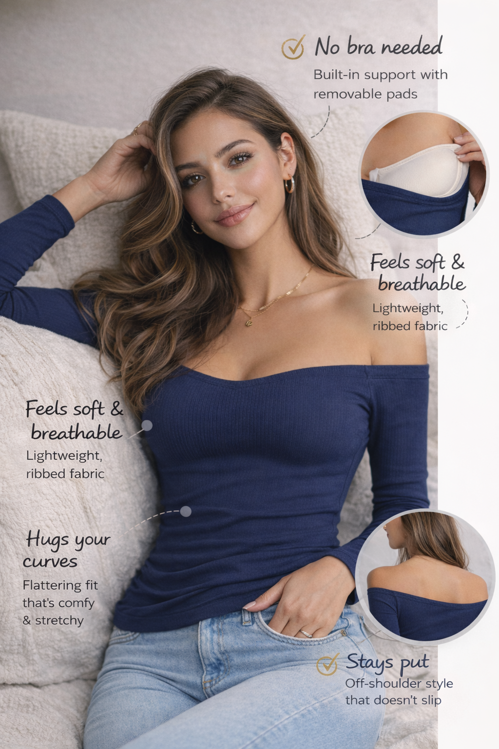 Made from a soft, breathable ribbed fabric, this top hugs your body in all the right places without feeling restrictive. The built-in support and seamless design ensure you stay comfortable all day, while the off-shoulder style adds a touch of elegance and sophistication.